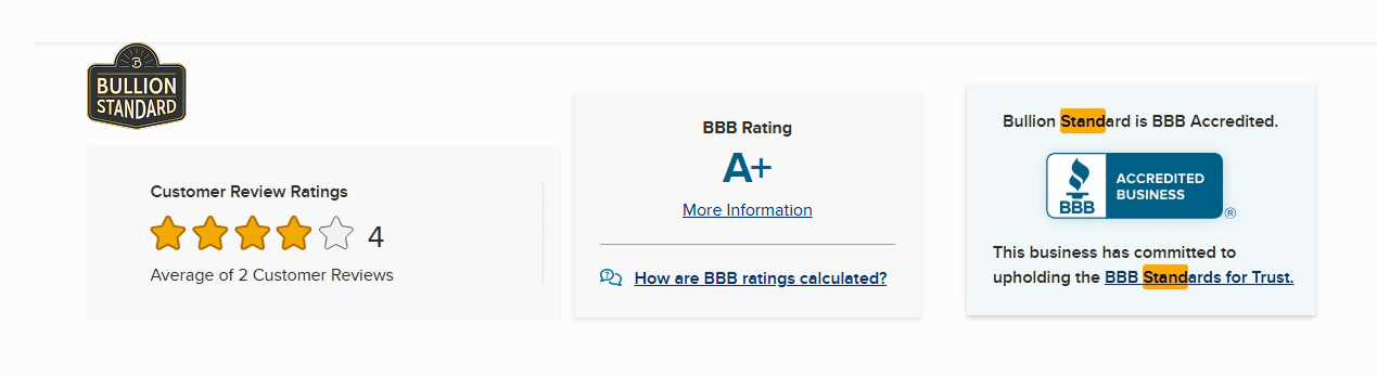 | BBB Rating Impact | A+ (builds 95% trust per surveys) | A (lower trust scores) | Bullion Standard |