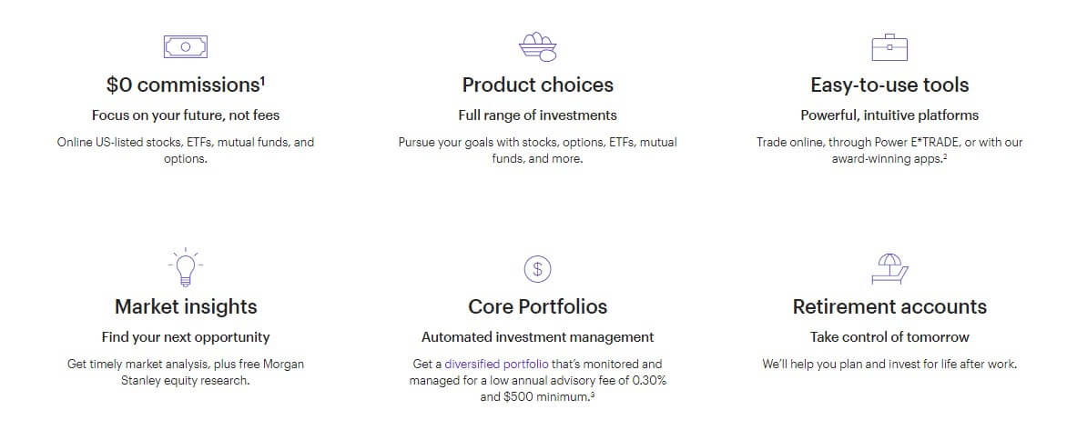 One of the key advantages of using ETrade is that they offer affordable and upfront pricing. Generally speaking, you won't pay a commission when you buy or sell shares of American companies in a self-directed brokerage account.