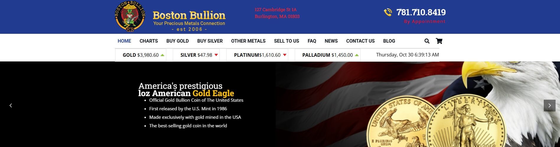 Boston Bullion stocks many government-minted coins and bars. Popular ones include the American Gold Eagle, Canadian Silver Maple Leaf, and PAMP Suisse platinum bars. They also have palladium bars.