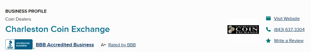 Charleston Coin Exchange is a family-owned coin dealership in Charleston, South Carolina. It builds trust with an A+ rating from the Better Business Bureau (BBB) and the owner's past job as a coin grader for the Professional Coin Grading Service (PCGS).