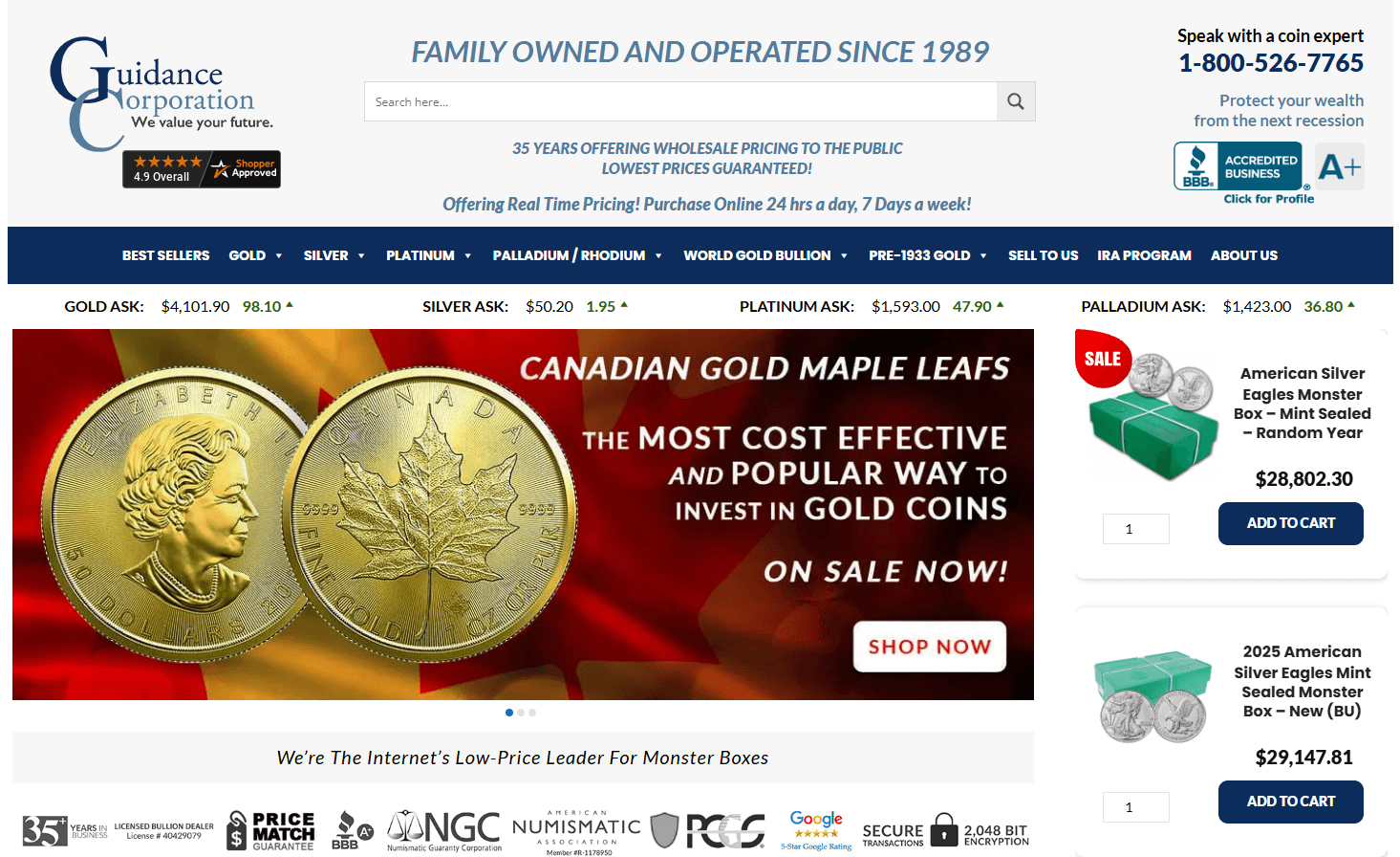 - Guidance Corporation started as a family-owned business in 1989. It operates from Minnesota and offers wholesale pricing on gold, silver, platinum, and palladium bullion and coins. They provide real-time quotes and a lowest price guarantee.