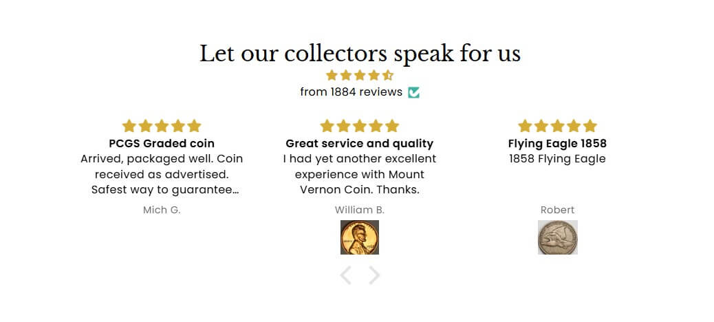 Mount Vernon Coin Company receives customer reviews averaging 4.9 out of 5 stars on eBay and Yelp.