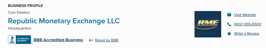 Republic Monetary Exchange holds an A+ rating from the Better Business Bureau. This shows their commitment to fair practices, great customer service, and happy clients in the precious metals world.