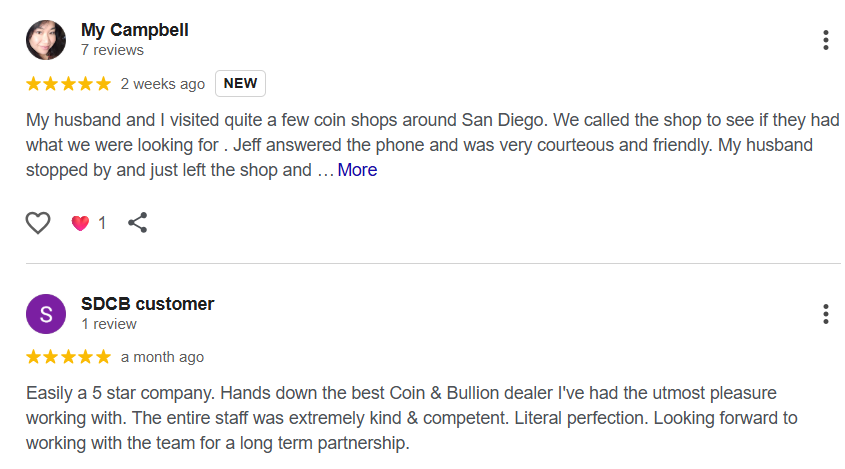 - San Diego Coin & Bullion earns high trust and customer satisfaction as a top dealer in San Diego. They offer expert appraisals and solid advice for precious metals and rare coins.