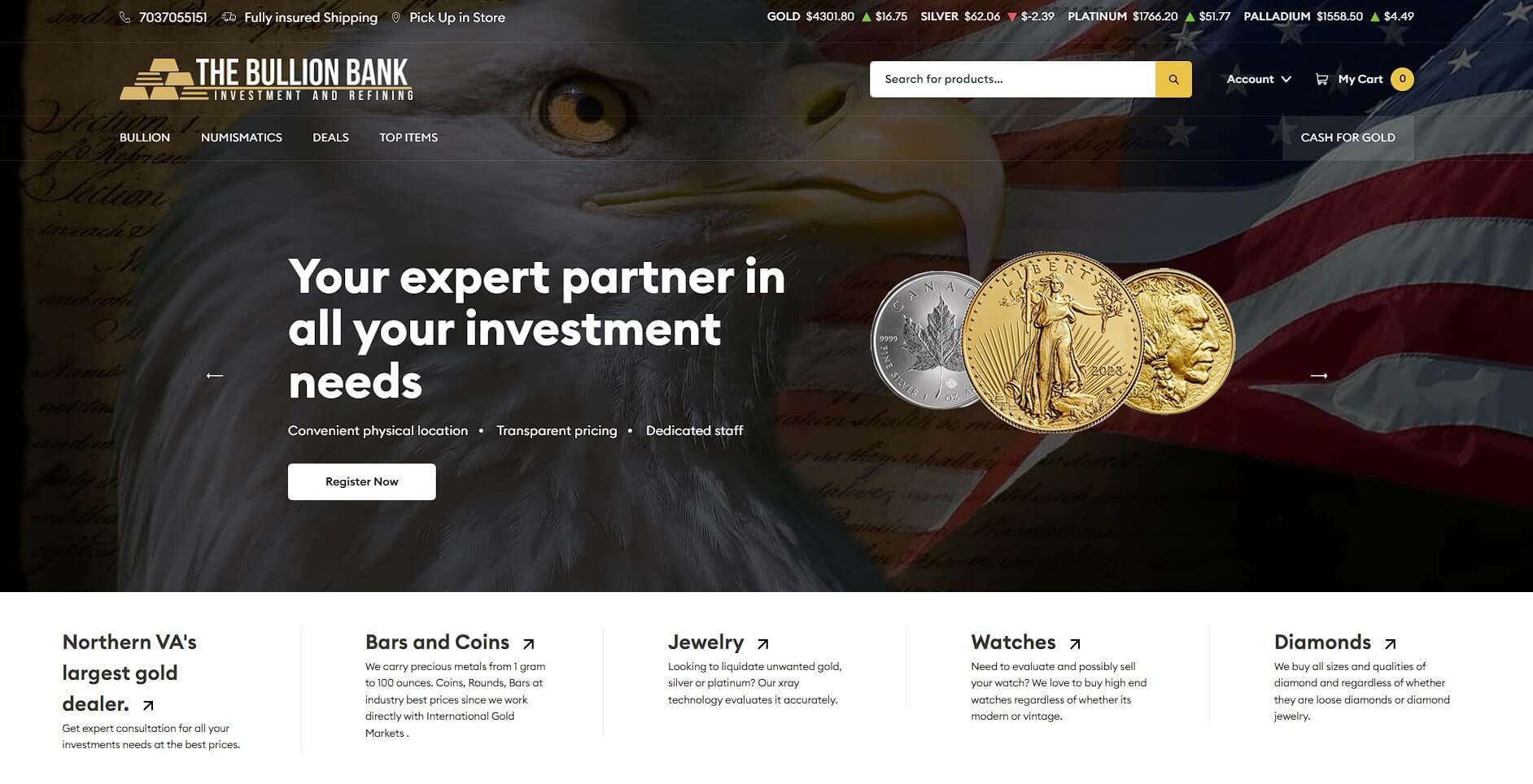The Bullion Bank offers full services and learning tools for buying and selling top-quality bullion. This includes gold, silver, platinum, and palladium in bars or coins.
